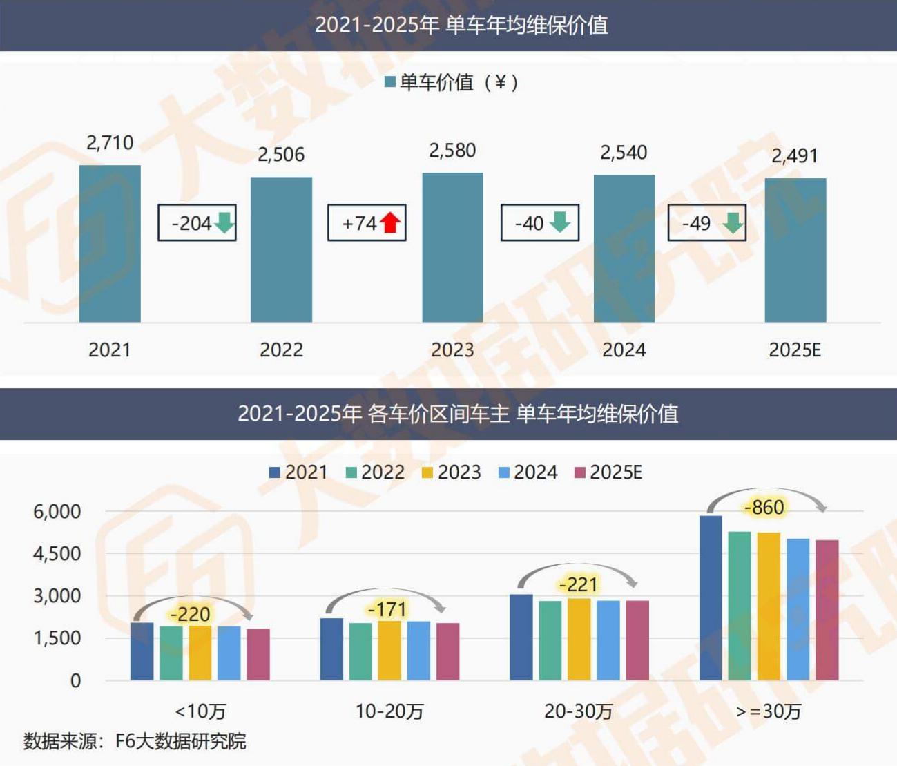 2025年,车主单车年均维保价值延续2024年的小幅下滑走势,已跌破2,500元。