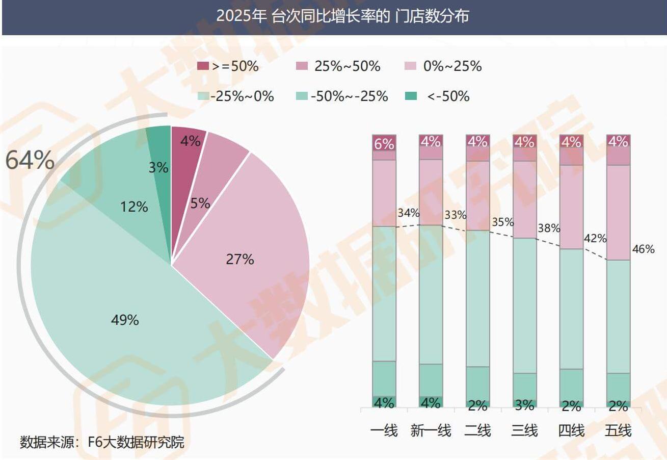 2025年门店台次增长呈现“低增长主导、高增长稀缺”的整体格局:累计超六成门店面临台次负增长压力,仅9%的门店达成了同比超25%的高增长水平,高增长门店的稀缺性凸显。