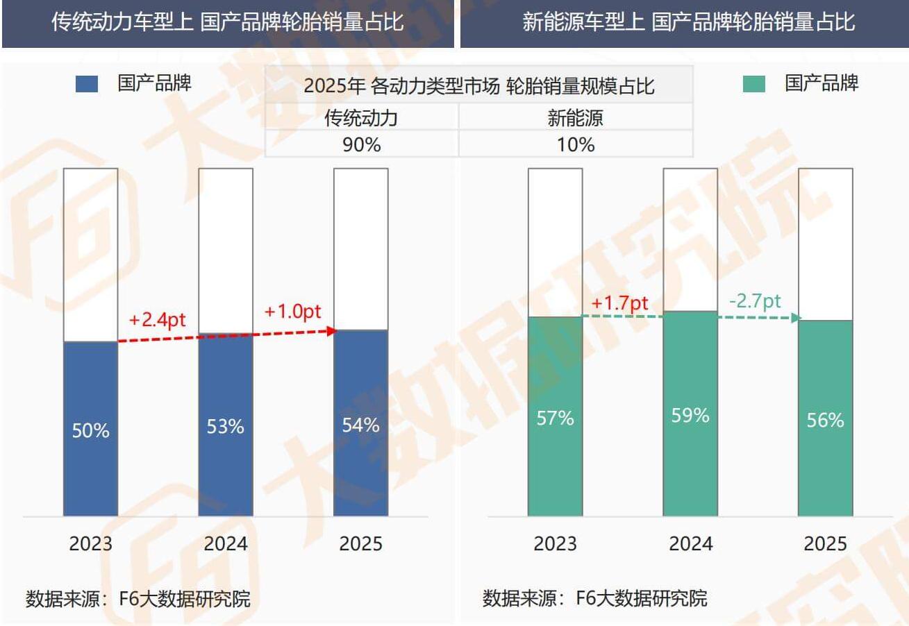 2025年乘用车轮胎市场中,传统动力车型以 90% 的销量规模占比占据绝对主导地位。