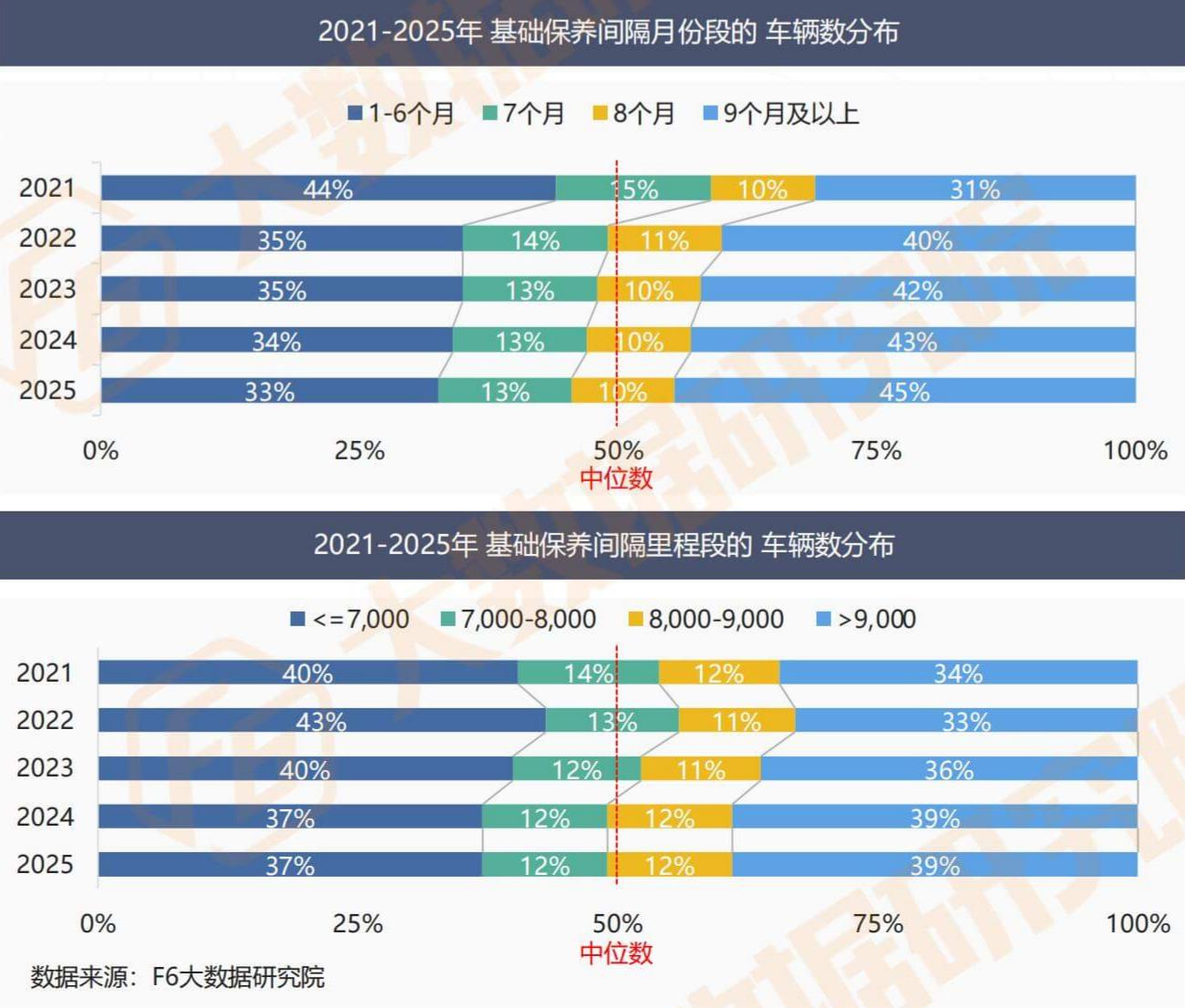 2025年,车主基础保养间隔时长继续后移:间隔9个月及以上才进厂保养的车主占比达45%,较2024年提升2个百分点;间隔月份中位数目前稳定在8个月左右,但仍呈后移态势。