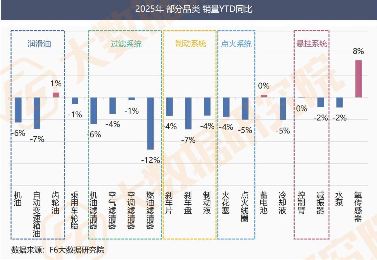 与上述品类形成鲜明对比的是,其他润滑油、乘用车轮胎、过滤系统、制动系统、点火系统等多个关键品类正承受不同程度的销量下滑压力。
