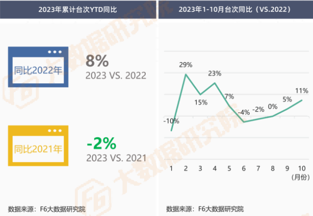 2023年累计台次同比2022年增长8%,但不及2021年同期水平,市场持续恢复中